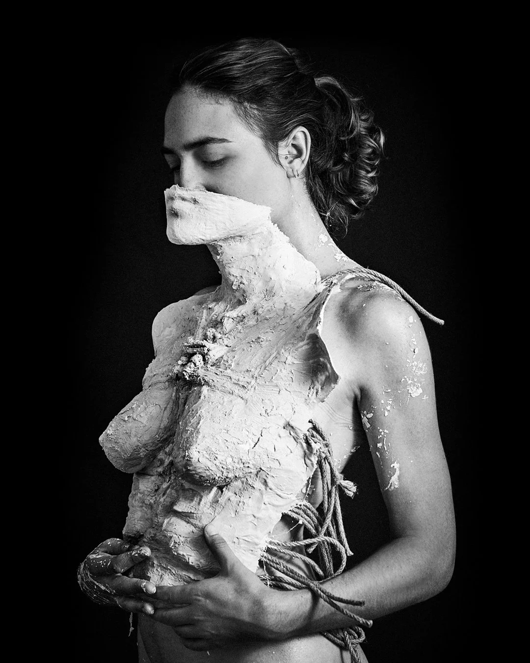 Schwarz-Weiß-Fotografie einer Person mit Gipsmaske und Körperbindung aus Seilen.